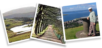 Douglas Park/Castle Hill walk at Largs 5km. There are various starting points for this walk depending on your ability. The main walk starts from the Largs promenade as you follow the path of Pencil Walk (click the map for details) until you reach May Street. Take a shortcut through Anderson Park and across the main road into Douglas Park. This pleasant park of formal gardens and tennis courts belies the strenuous climb ahead. Even if you are not going all the way to the top of hill, you should pass through the gates to the upper park and make a short detour right to the Haylie Chambered Tomb (see HISTORY page). This small but ancient 3000BC Neolithic tomb was discovered in 1772 by James Wilson of Haylie when it still contained the remains of 5 people.Retrace your steps to the gate into the upper park and climb at your leisure stopping periodically to admire the views of the Clyde. Having accomplished the long flight of steps, walk south to view the surrounding hills from the indicator at the viewpoint.From the viewpoint follow the circular route north to Castle Hill. This appears as a rocky knoll on top of which are traces of an Iron Age Fort. There are signs of a ditch topped by a low rampart. Continue the circular route until you rejoin the path back to the promenade.