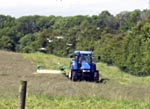 The main gravel road continues to the left at the fork to Ryefield House. The Doggartland Walk follows straight ahead beyond the entrance to Ryefield Stables. Doggartland Farm is to the right. Follow the path past the Stables on the left to more open farmland.