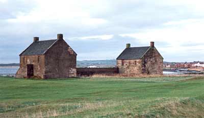| At Prestwick, at the south end of the promenade, on the golf course, you will see two small buildings. These are the salt pan houses which once produced salt in shallow ponds between the two buildings. Once evaporated the product was heated by brick vaults. The salt industry dates back to the 15th century.The salt pan houses date from 1760. The salters lived above the salt drying area and you can still see the outside stairways which led to their quarters. Salt was highly taxed and the industry suffered from smuggled salt which was brought in from Ireland. |