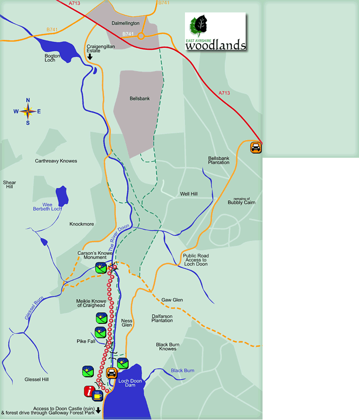 There are numerous paths and trails in the Dalmellington area including Loch Doon and Ness Glen river side walk. You can access many of these by leaving the A713 about a mile (1.6km) south of Dalmellington. A regular bus service on the A713 provides access for walkers and cyclists (note that the Ness Glen walk is not suitable for most cyclists).