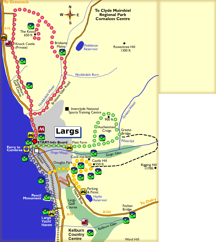 Knock Hill Walk at Largs 11km. From the car park at the beach across from Nardini's walk North along the seafront. Passing the RNLI lifeboat station you will see a slipway down into the water. This was used to transfer Catalina seaplanes to and from Barrfields (across the road - now Vikingar) for repair during World War II.Continue along the promenade and then follow the path by Noddsdale Water, crossing the A78 main road into Barr Crescent. Keep to the path by the burn until you reach Brisbane Glen Road. Opposite the cemetery you pass gates that once marked the entrance to the home of the Brisbane family, important landowners and benefactors to Largs.Follow the road past the houses on the right. Once in the open country look for a drive on the left which heads towards Brisbane Mains Farm, a white building below Knock Hill. Take this path which passes by Brisbane Mains and winds behind the hill. On the North side you have the option of a spirited climb to the top where you will find great views, the remains of a hill fort and a triangulation point. The other option is to take the spiral track up the hill and as you climb think of the grand ladies who would travel up by horse-drawn carriage to picnic while their husbands were shooting in the Brisbane Estate below.Rejoining the main path head West along Blackhouse Burn to the paved road near the Manor Park Hotel. Follow the Routenburn Road South again past Knock Castle (private) and stop for some great views across the Clyde. Follow the road past Routenburn Golf Course until you rejoin the A78 back to Largs. The gatehouse to Netherhall marks where Lord Kelvin the renowned scientist and mathematician once lived. Where the road crosses the Noddsdale Water head through the small park to the point with fine views and return to the town centre.